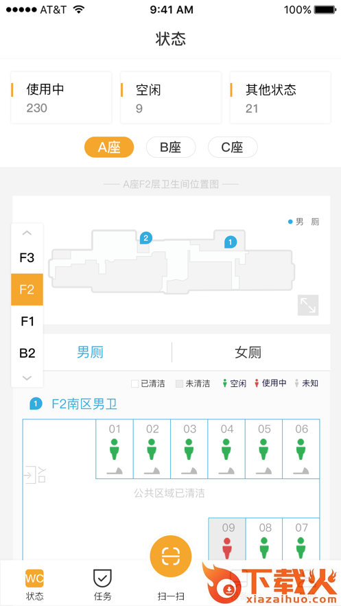 用于保洁人员对卫生间的管理,包括厕所状态查看、保洁任务派发、智能出纸机运行状态查看、智能出纸机设备操作等功能。