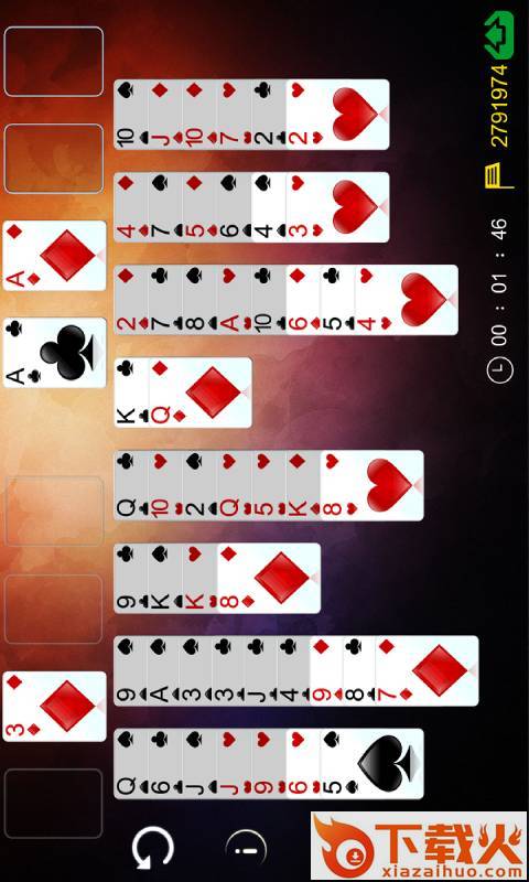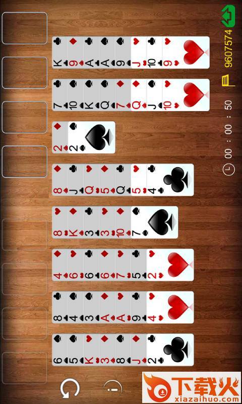 它是一款比较有趣的扑克接龙游戏。游戏只用一副牌玩,获胜的关键在于玩牌区角处的四个“可用单元”,在四个回收单元中各创建一叠牌,每叠13张,且花色相同。每叠牌必须按从小 A)到大 K)的顺序排列。