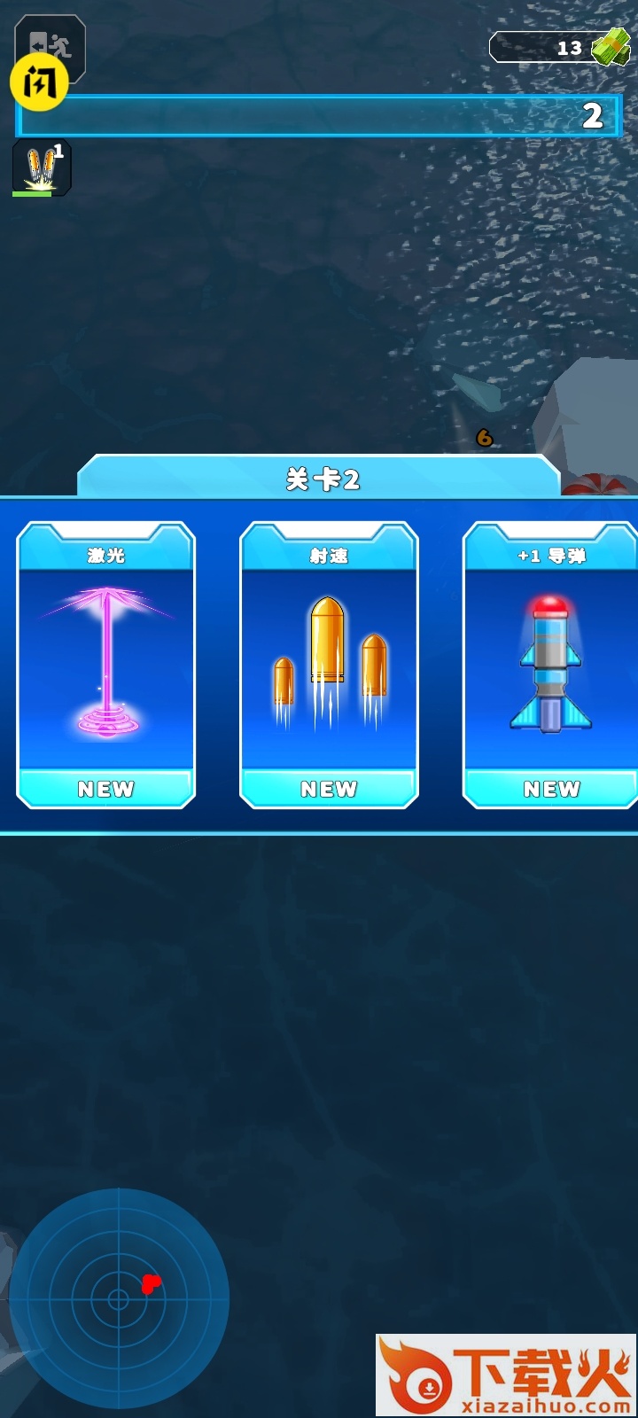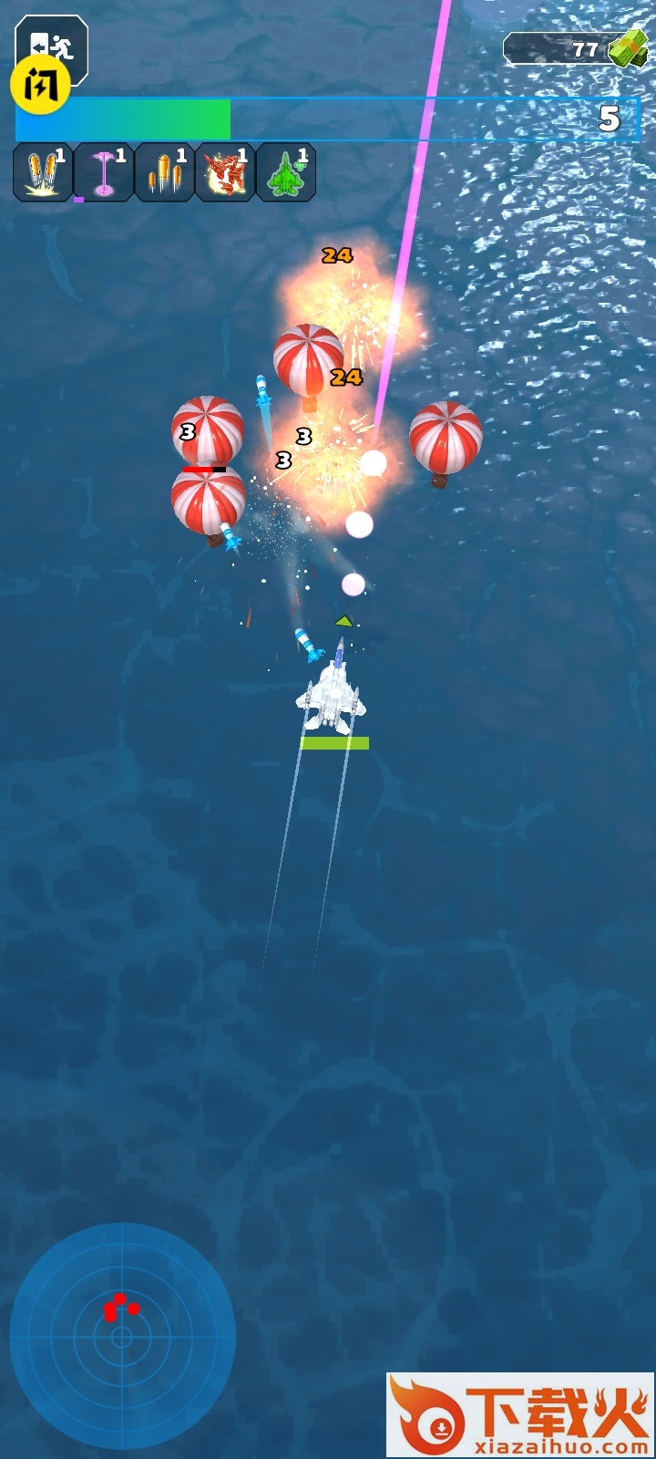 3、玩家只需控制战斗机的飞行走位,战斗机会自动发射导弹进行攻击。