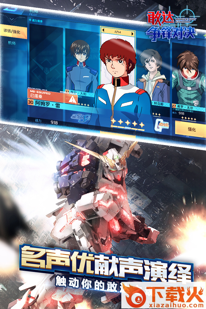 《敢达 争锋对决》由日本国民级动画IP《机动战士敢达》系列授权,万代南梦宫(上海)和恺英网络联合打造的正版敢达动作对战手游。游戏拥有对战模式、竞技场模式、剧情模式、挑战模式等丰富玩法,你可以收集和养成动画中的人气机体和机师,一手打造强大的机动战士小队,满足自己在手机上驾驶敢达热血战斗的梦想!你就是下一个王牌机师!