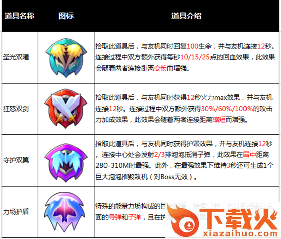 常规关卡中的核弹、冲刺、无敌护盾、护罩、血心都可以在双打关卡中掉落,而磁铁不会在双打中掉落。另外,新增了4种双打道具: