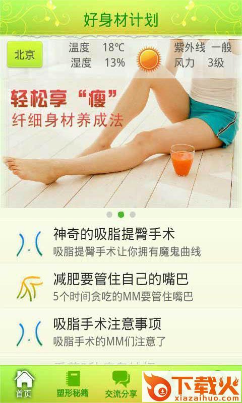 塑造挺拔S曲线,hold住完美身形,好身材计划APP帮你击败顽固脂肪,轻松享“瘦”;让胸部展现由A到D得惊变;医疗塑形轻松拥有S形身材,没有丑女人,只有懒女人,跟着《好身材计划》,行动起来!