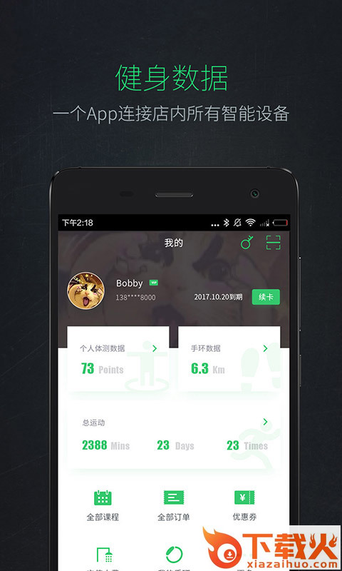 线上Liking健身app终端与智能手环相结合,日常、健身、体测三大数据监测,