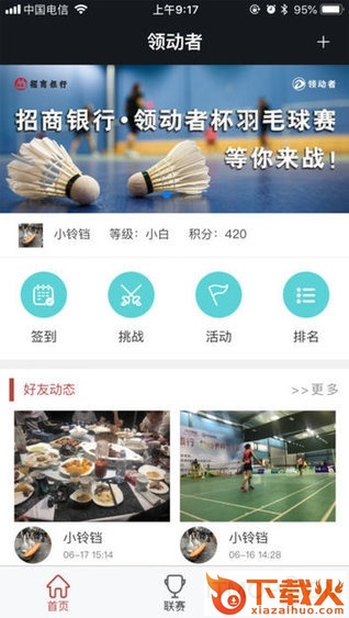 “挥拍吧!我们”是领动者官方和海看体育共同推出的,一档以羽毛球为载体的线下场地真人秀活动,可以随时在领动者App报名参与。5. 3.积分功能