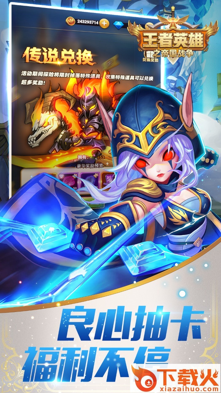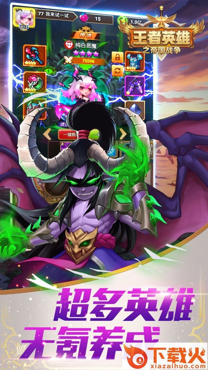 王者英雄之帝国战争是个根据魔兽背景制作的卡牌冒险游戏,在王者英雄之帝国战争中有伊利丹,剑圣,牛头人等等熟悉的英雄角色,每天连续签到可以抽取想要的ssr级英雄,轻松放置对战,提供百变的阵容战术。