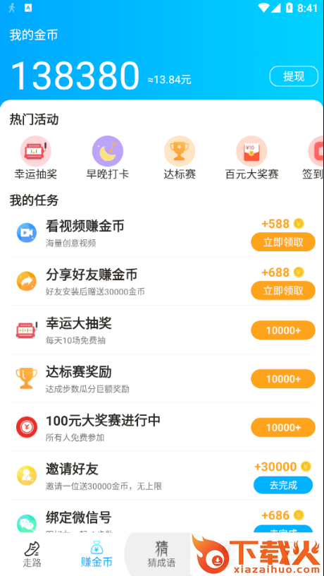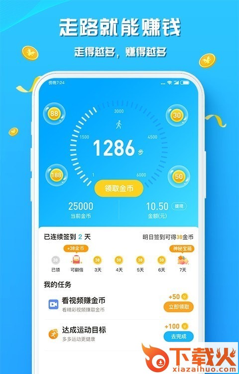 走路赚钱花是一款走路就能赚钱的app,每天步数可以兑换金币,走得越多兑得越多,当天即可提现到账。