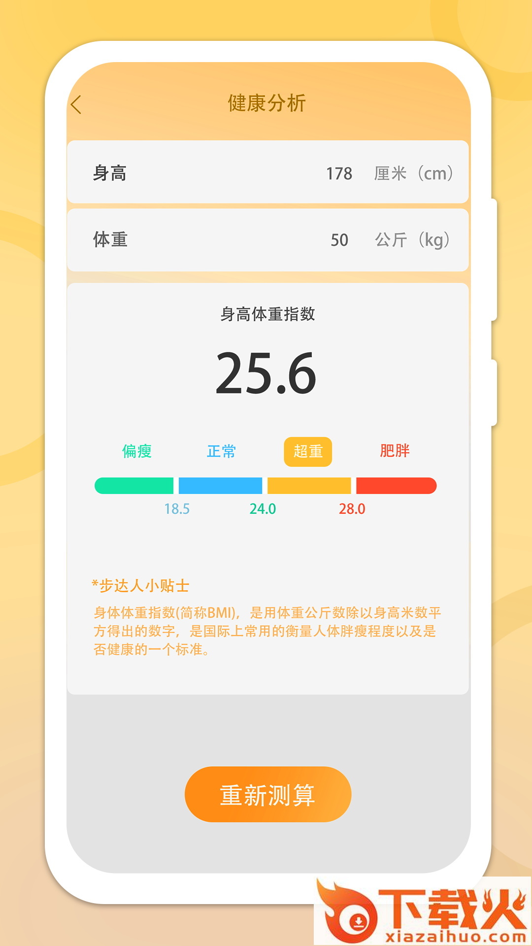 还可以手动输入数据,根据身高和体重,实时分析BMI指数,并对比对应的健康状态。还有贴心的健康运动的知识小贴士,帮助培养运动习惯。