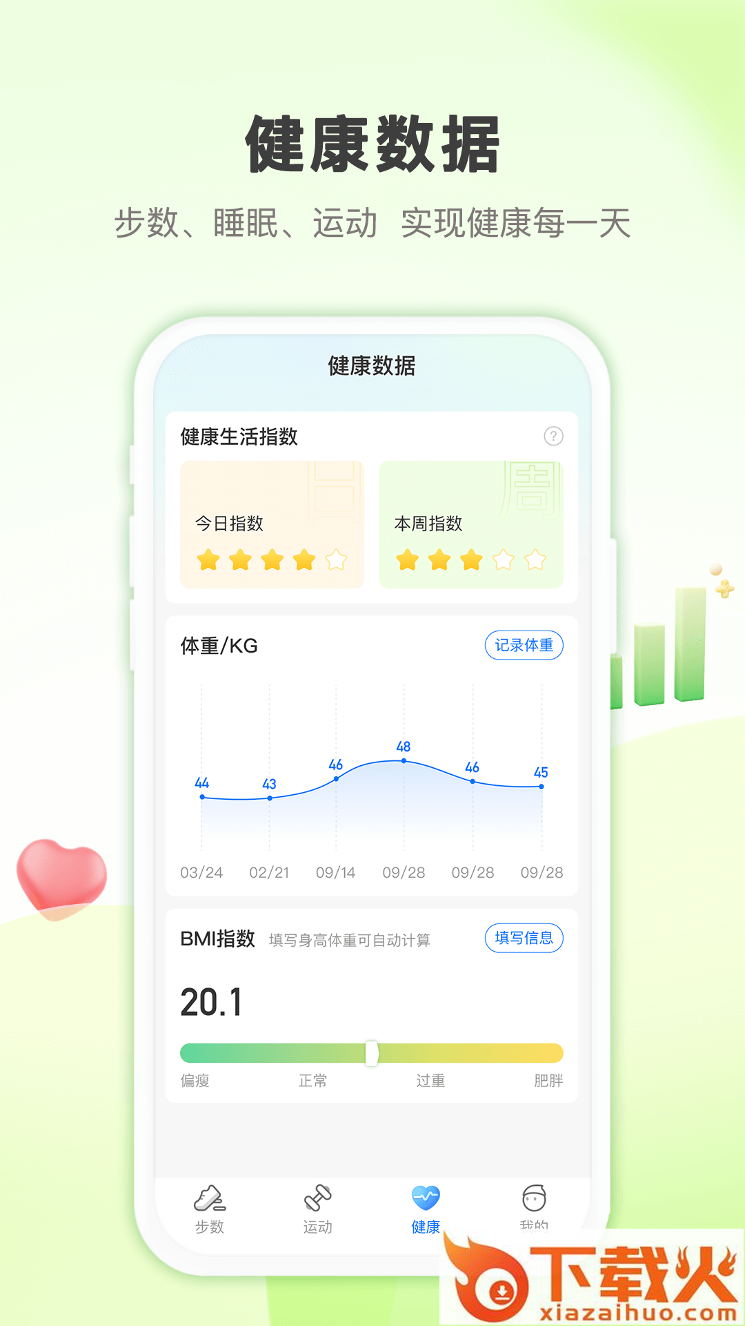 通过用户每日步数、运动时长、早晚打卡情况生成健康指数,轻松掌握健康生活状态,在不停鞭策自己的同时获取满满成就感。提供体重记录,BMI指数,用户可随时查看体重变化,进行身材管理。