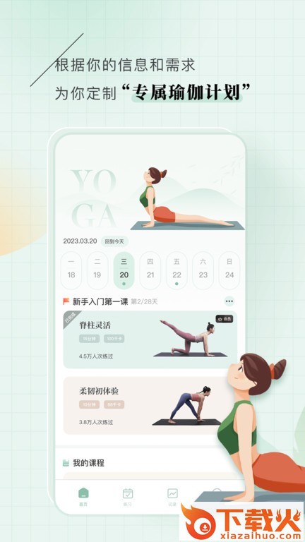 1、专属计划制订:通过收集你基本信息和瑜伽目标从而为你量身打造一套瑜伽练习计划,在你完成本次计划后生成计划报告。