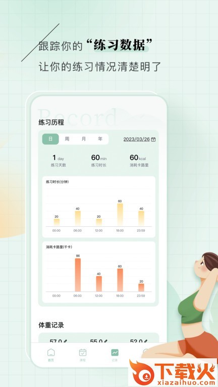 4、练习数据跟踪:记录你完成的计划或者课程,给出天、时长、卡路里总数据,以图表的形式呈现,更加直观。