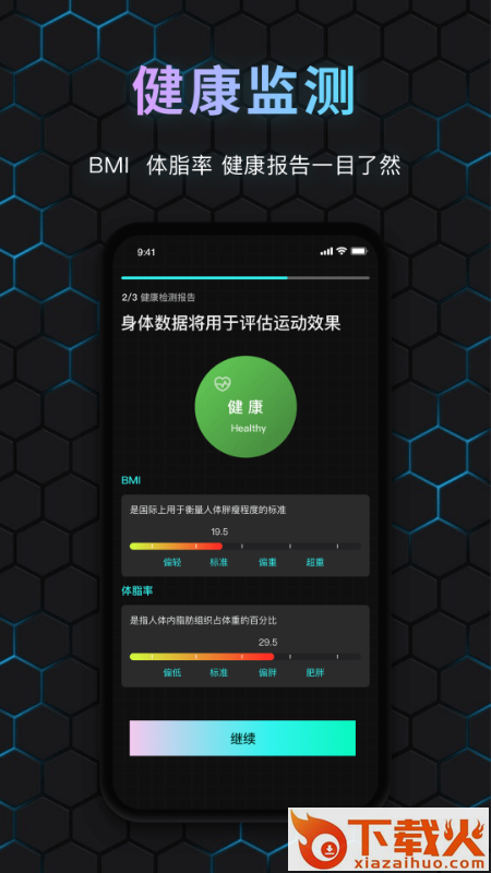 健康监测功能会根据您的身高、体重等信息智能计算BMI、体脂率等健康数据,