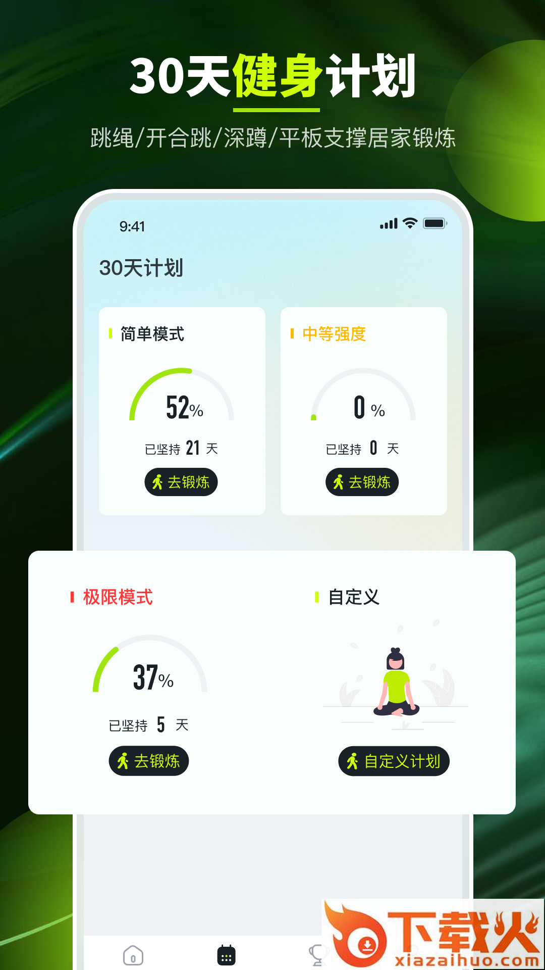 2、30天健身计划,跳绳、开合跳、深蹲、平板支撑等。