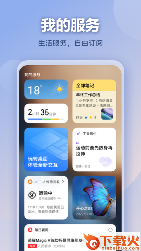 包括快递、出行、酒店预订提醒等,方便您快速浏览和使用;您也可以根据自己的使用习惯,增加、删除服务卡片,调整卡片布局等。