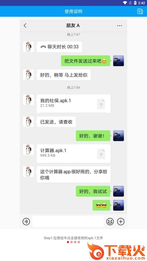 微信接收apk文件之后,在文件名末尾会自动添加.1,导致系统无法识别出这是一个应用安装包,用户不得不使用另外的第三方软件找到该文件对其重命名,然后将末尾的.1删除才能进行安装。但有时候单单找apk.1文件都要半天,甚至找不到,费时费力,效率比较低下。本应用完美解决该问题:用户直接点击apk.1文件即可打开进行安装。