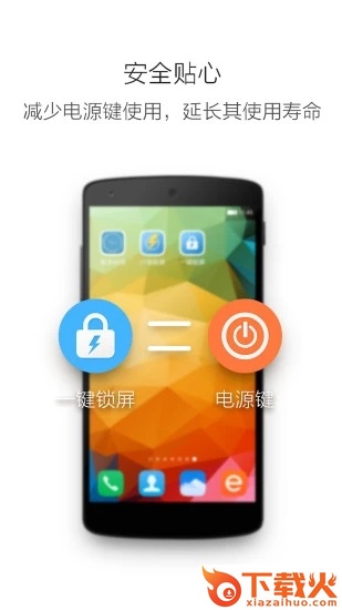 一键锁屏,快捷锁屏,安全贴心。手机桌面上,点击“一键锁屏”图标,即可快速锁屏,减少手机电源键使用,延长其使用寿命。软件小,绿色纯净无广告,是您装机必备的实用软件。