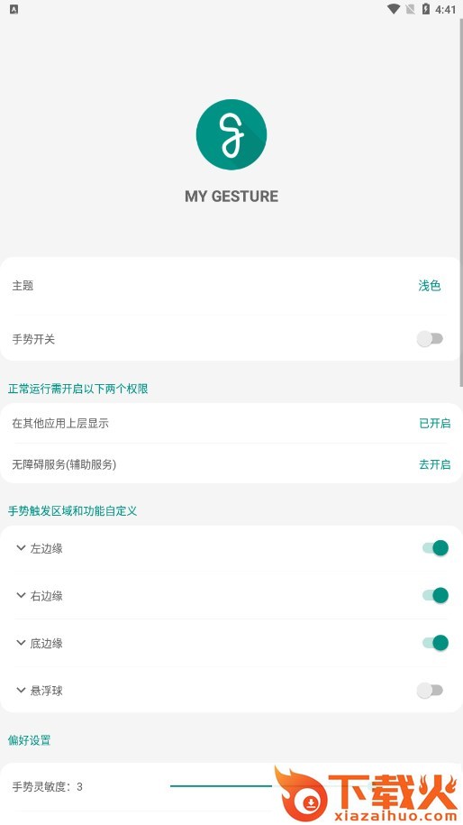 1.手势正常运行需要“浮动窗口权限“和“无障服务权限”,请按提示开启(一些国产ROM需要手动另外开启悬浮窗口权限)。