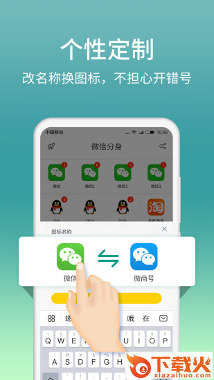 微分身版免费版app是一款支持双开、分身或多开的应用,可以支持同一台手机同时登陆多个微信账号,聊天达人再也不用换来换去登多个账号。自由编辑图标、名称、添加到桌面等,一切随心定制。
