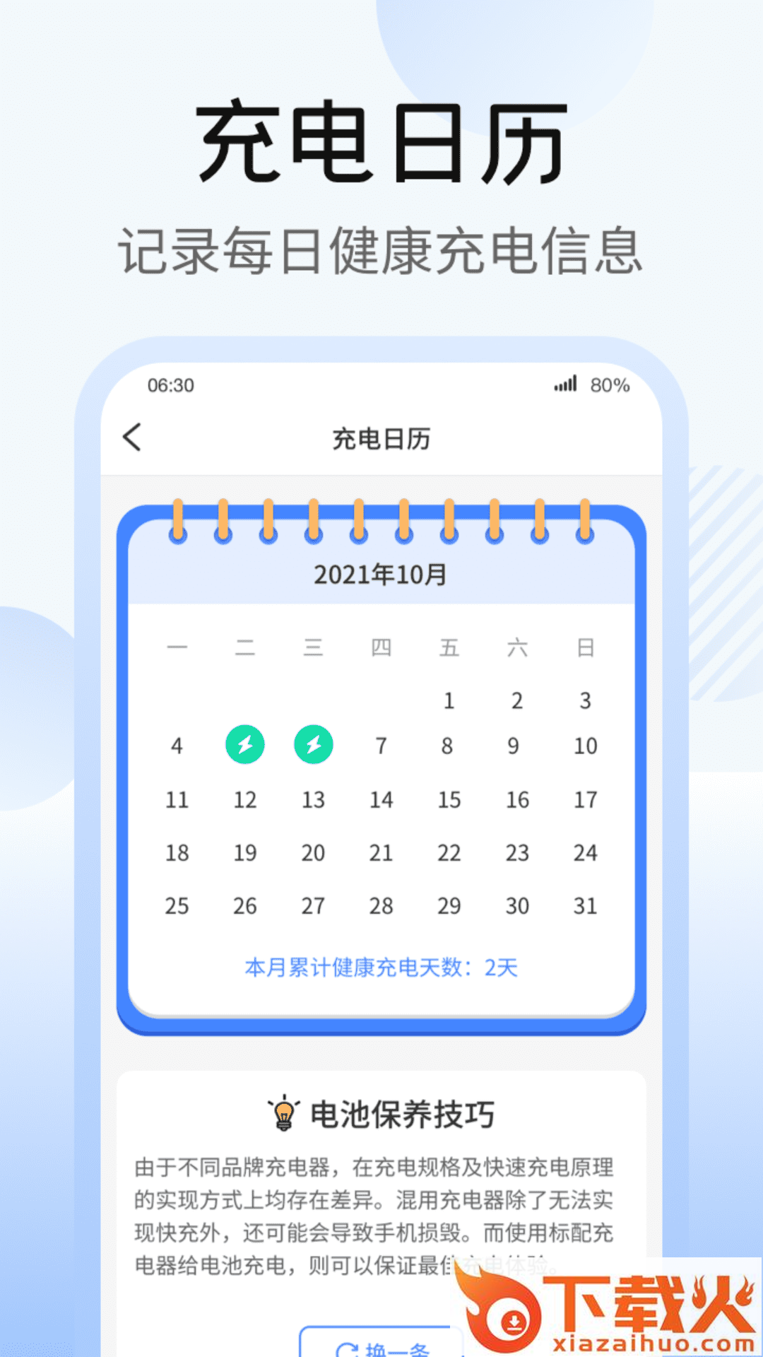 【充电日历】记录每日健康充电信息,完成健康充电打卡,为手机快速运转护航。