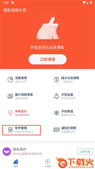 1、首先打开猎豹清理大师app,进入到首页中后点击【软件管理】;