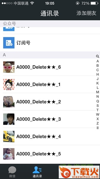 第七步:全部标记完成后,在你的手机微信上,进入“通讯录”,就在星标朋友下面排在最前面那些的以A0000_Delte开头的就是已经把你删除的好友,这时候你就可以一个个删掉他们了。