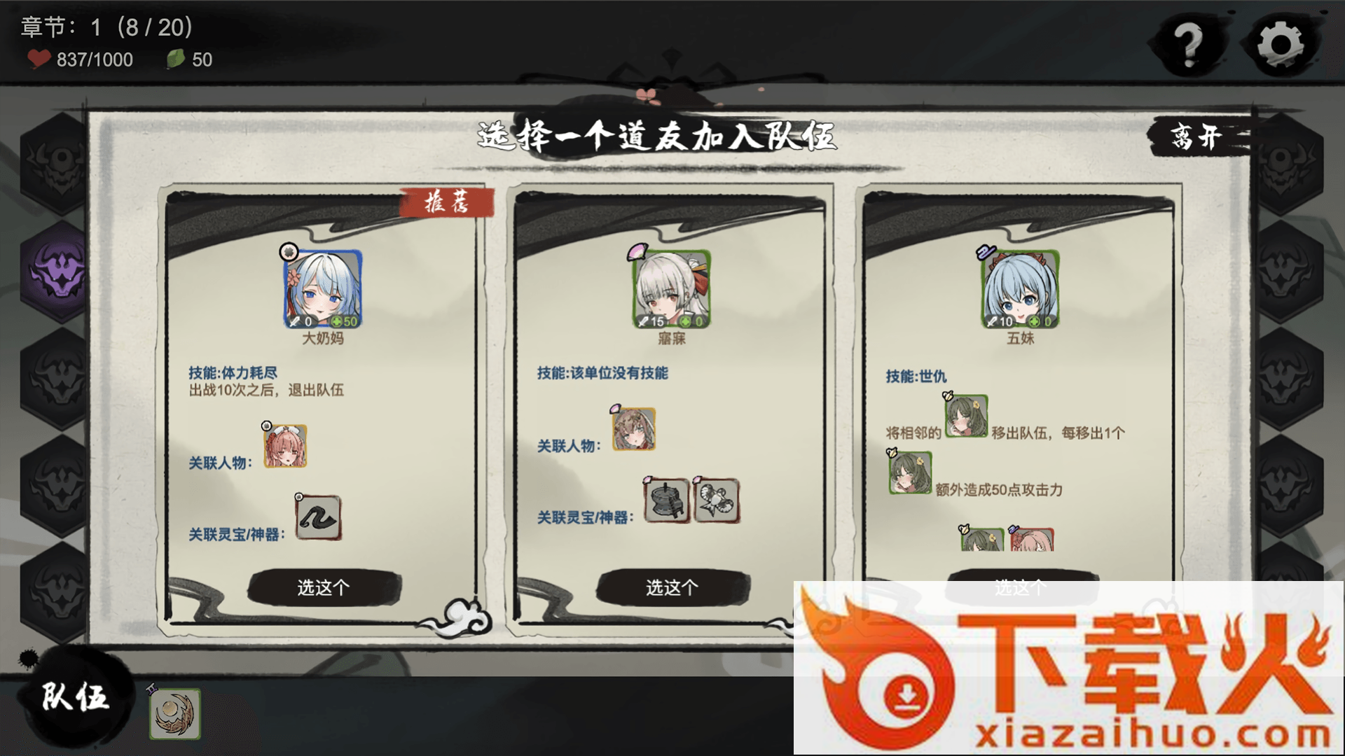 选择关卡闯关,过关后选择道友加入队伍。