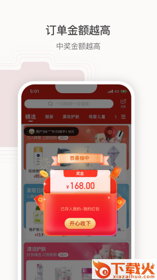 官方自营、品牌直采,每一个订单都中奖,现金奖可提现可购物,订单金额越高,中奖金额越高。