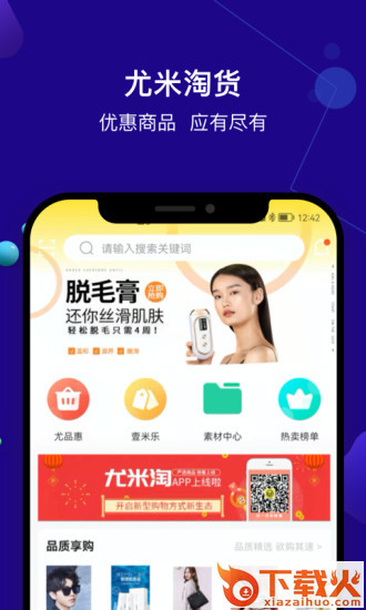 尤米淘App,优惠商品,应有尽有;商品特惠,精品好货,一网打尽;玩赚积分,积分商城,品质好物;素材中心,所有素材,一目了然;活动专区,所有权益,尽在掌握。