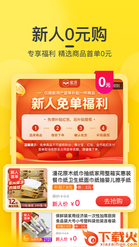 注册蜜源享优惠,首次下单相当于不用钱,新人免单专区数十款宝贝每日更新,0元也能领回家!!!