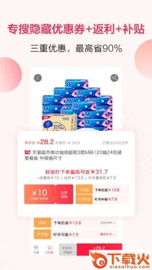 搜索省钱: 您在淘宝内看中的商品,复制商品标题在好省吖搜索就可以领取优惠券+红包,一次性帮您省掉两笔;