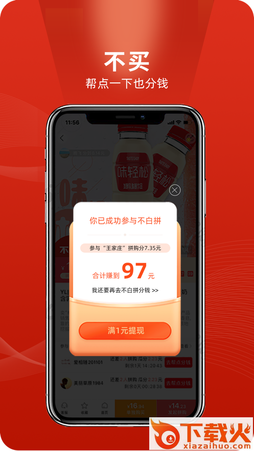不白拼创办理念是“低价拼购,不买帮点一下也分钱”,