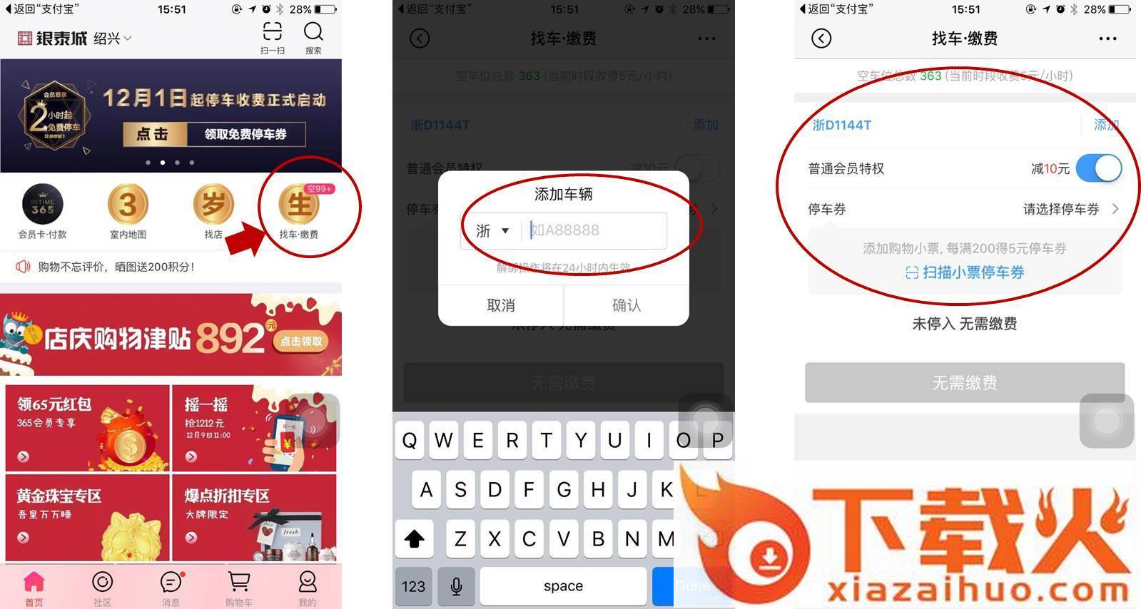 进入app首页→点击找车缴费→添加车辆→识别您的会员等级即可享受指定的免费停车时长→其余缴费部分可通过支付宝或现金支付。