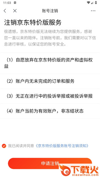 5、在账号注销的页面中我们需要点击的是【注销京东特价版服务】;