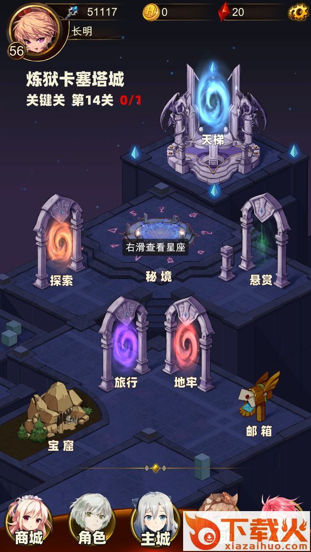 如果重新进入游戏或不小心回到主城,可点击<探索>选择最下面亮起的关卡即可继续闯关。