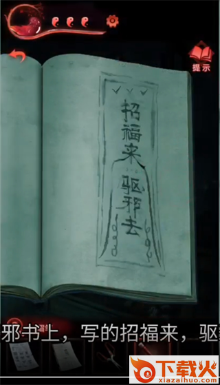 7、输入密码后即可拿到笔,随后根据邪书上写下招福来,驱邪去