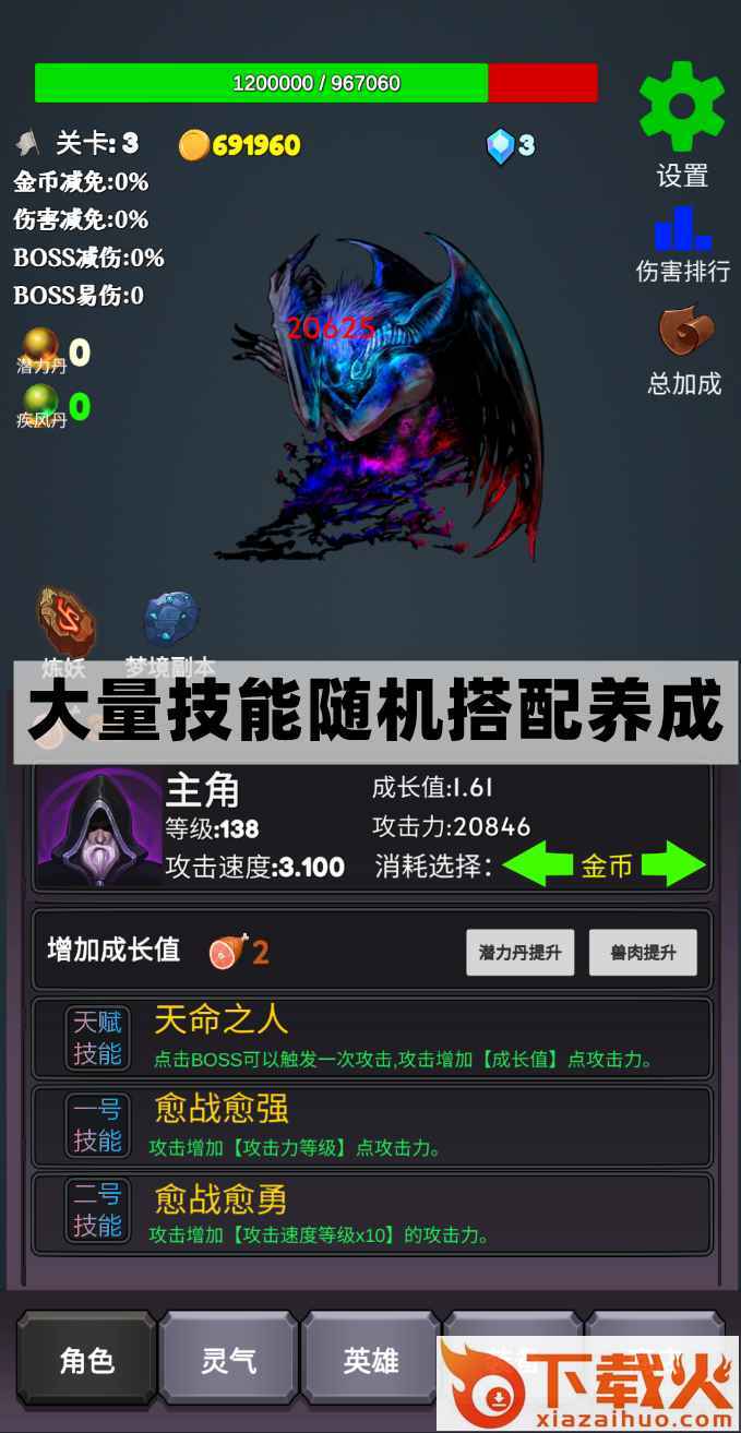 通过不同的技能堆叠可以合成不同的道具,击败最终BOSS大魔王。