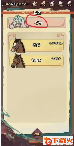 1.点击“出城”图标,来到市集界面。在市集界面的左侧选择好要购买的物品类型后,滑动至页面找到马匹商店并点击进入。接着浏览店内所提供的各种马匹商品,挑选自己喜欢的马进行选购。选中喜欢的马匹之后与商家交谈确认价格并进行交易即可获得该马匹。最后记得给自己的新坐骑起一个炫酷的名字就可以畅快的驰骋江湖了。