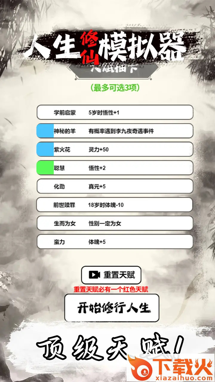 人生修仙模拟器游戏中修仙漫漫路途,可以自由随机选择天赋,洗资质,洗髓,打造你想要的修仙者,在修行中来感受天地变化,征服妖魔自然。