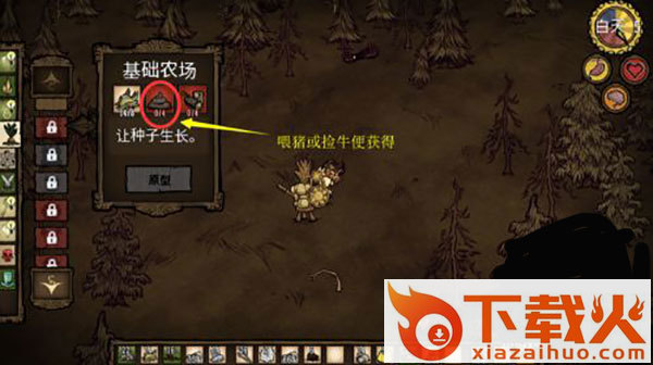 2、前期精神值可以通过采花、做花帽提高,中后期和猪人交朋友(给怪物肉猪吃)和睡觉也可以提高精神。