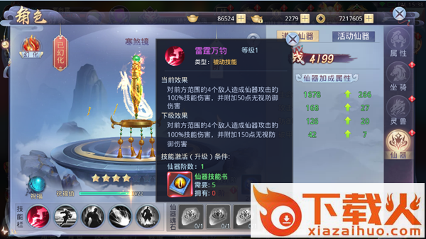 如图所示,仙器共有5个被动技能,第一个技能会在解锁仙器的同时自动激活,而其他的四个技能则分别在仙器达到3,5,7,10阶时激活,激活仙器技能可以提升仙器属性,同时达到提升总体战力的效果,所以,想要快速提升战力的仙友们,还墨迹啥呢?赶紧去升阶升阶下你的仙器吧~