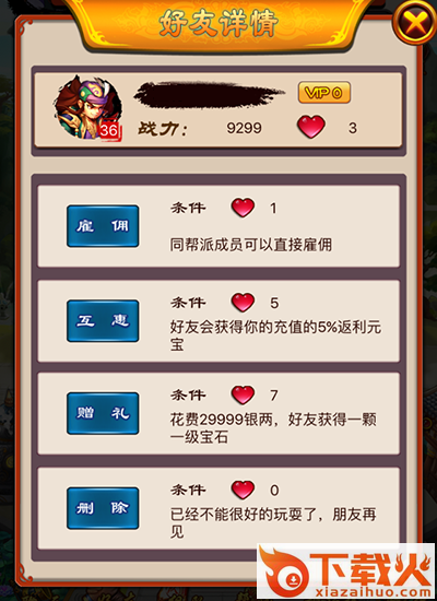 点击好友头像进入“好友详情”界面后,则会出现4个功能――雇佣、互惠、赠礼和删除。