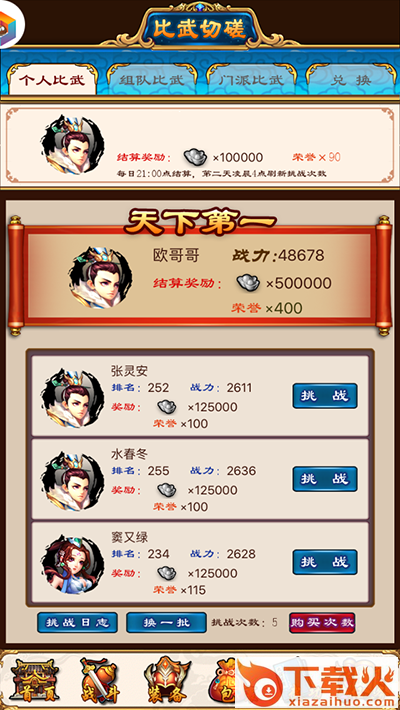 “个人比武”就是大侠争当武林第一的最直接途径了,这里可以遭遇各大门派的侠客,击败他们,获取奖励和荣誉,提升名次,就能令大侠离梦想更进一步。
