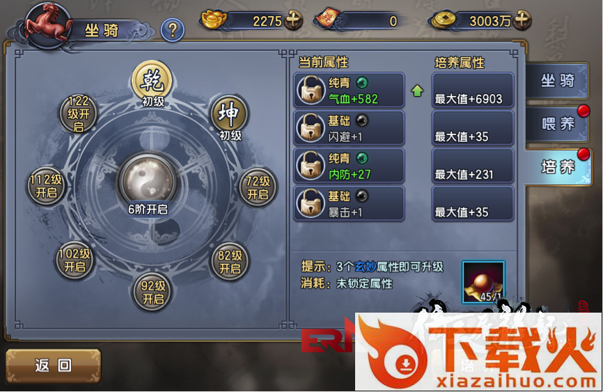 至于培养嘛,则是更深的养成线了,如果坐骑确实是非常稀有的好东东,那么久可以通过培养让其更具战力。其中的九个培养槽都可以通过等级解锁,而每个培养槽会对应相应的附加属性……恩,需要好好斟酌斟酌。
