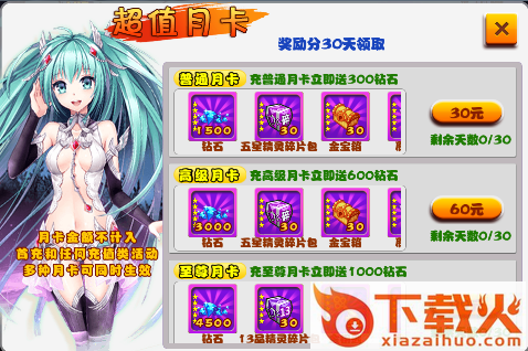 如果感觉免费的还是少, 可以买个月卡, 每天可以领取N多钻石, 道具, 礼包等, 月卡返还的物品价值是月卡本身的5倍, 超级实惠哦~ 三种不同的月卡满足不同的玩家需求, 给的再多也不如懂你~~(主页点击 '我是月卡党' 进入月卡购买页)