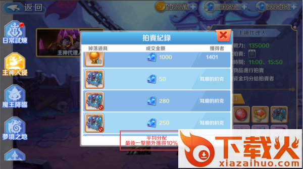 在主神入侵中击杀怪物掉落装备会进行拍卖,玩家可以进拍,拍卖结束后根据伤害平均分配,给予boss最后一击的玩家可额外获得10%的分红。