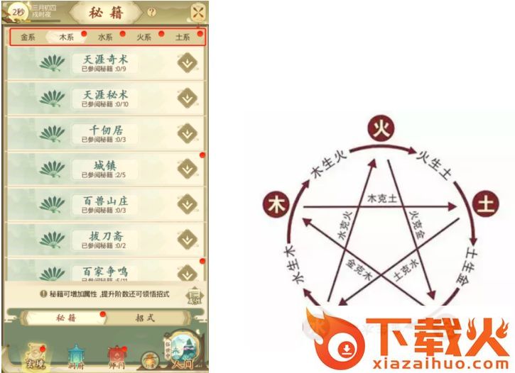 秘籍有金,木,水,火,土五大属性之分,五行关系遵循着水克火,火克金,金克木,木克土,土克水等环环相克,环环相生得关系。