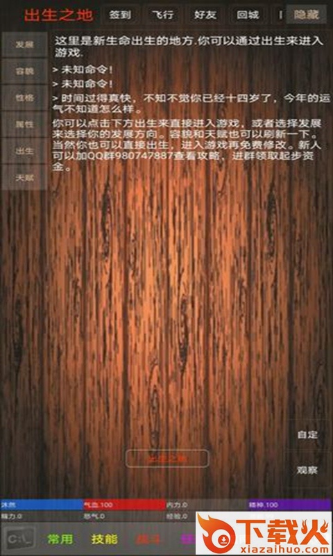 进入下一个界面,然后点击左上角的偏属(这里就要注意一下最好不要点最后一个均衡型因为很多武学都学不了),接下来点击洗点(直接点击第一个选项就可以),左下角有个输入指令点击它,然后输入look(空格)你的账号,点击确认,会显示你的信息,这里查看你的外貌,如果觉得不好,可以再次点击洗点,到满意为止,然后就是天赋有九个,这里我就不一一说了,新人最好直接选鸿运当头(吃丹效果100%),因为游戏里面其他天赋吃丹药会有概率无效,游戏里面可以用天赋书刷天赋。