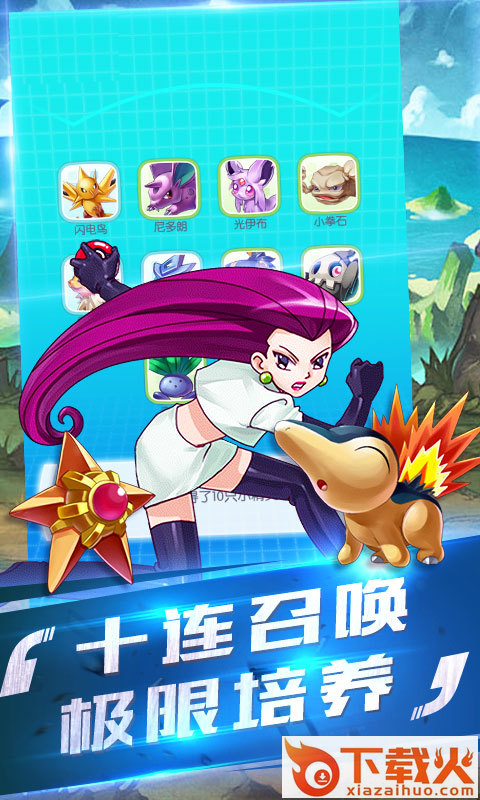2、超精致华丽日系画风,神奇宝贝的多样三种形态,每进化一阶都有大惊喜;超级炫酷技能展现以及全屏大招释放,全新视觉体验。