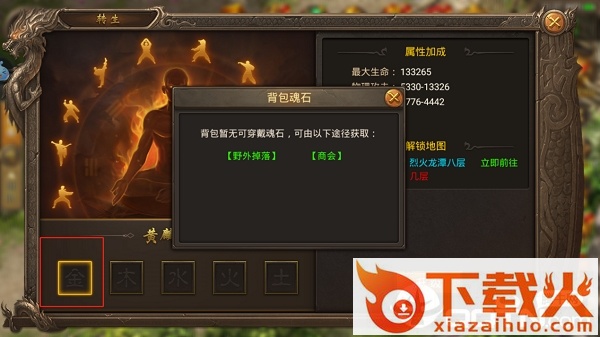 转生等级是从青龙10转 (普通转生丹)-白虎10转(高级转生丹)-朱雀10转(史诗转生丹)-玄武10转(史诗转生丹)-黄麟10转(幸运币),转生界面下方有魂石槽,可以穿戴金 木 水 火 土这五行的魂石提高角色的属性增加,目前转生最高等级是到黄麟10转。