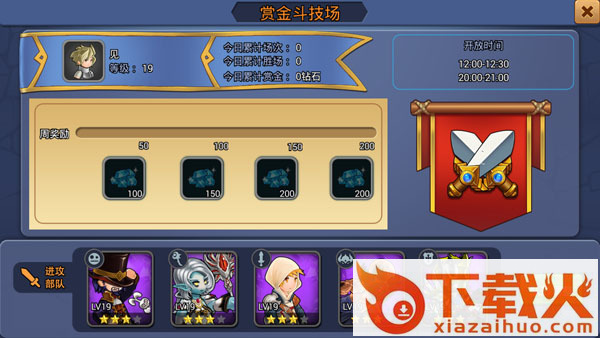 当玩家达到20级以后,赏金竞技场将会对玩家开放。赏金竞技场在每日的12:00-12:30和20:00-21:00开放,开放期间玩家可以在赏金竞技场自由匹配对手,获胜将得到4钻奖励,即使输了也可以获得2钻奖励。每周的累积获胜场次越多,将可以获得特别的周奖励。