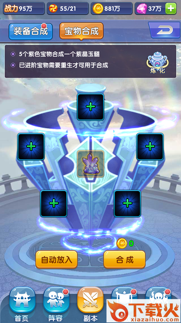 宝物合成在33级开放。5个紫色宝箱可以合成出一个精华宝石,精华宝石又可以用于宝物的进阶。这个游戏很多道具都不仅仅是出售这一种消耗方式的,很多时候玩家不用的道具也可以变废为宝的。合成就是资源回收再利用的过程,我们的目标是:没有浪费!